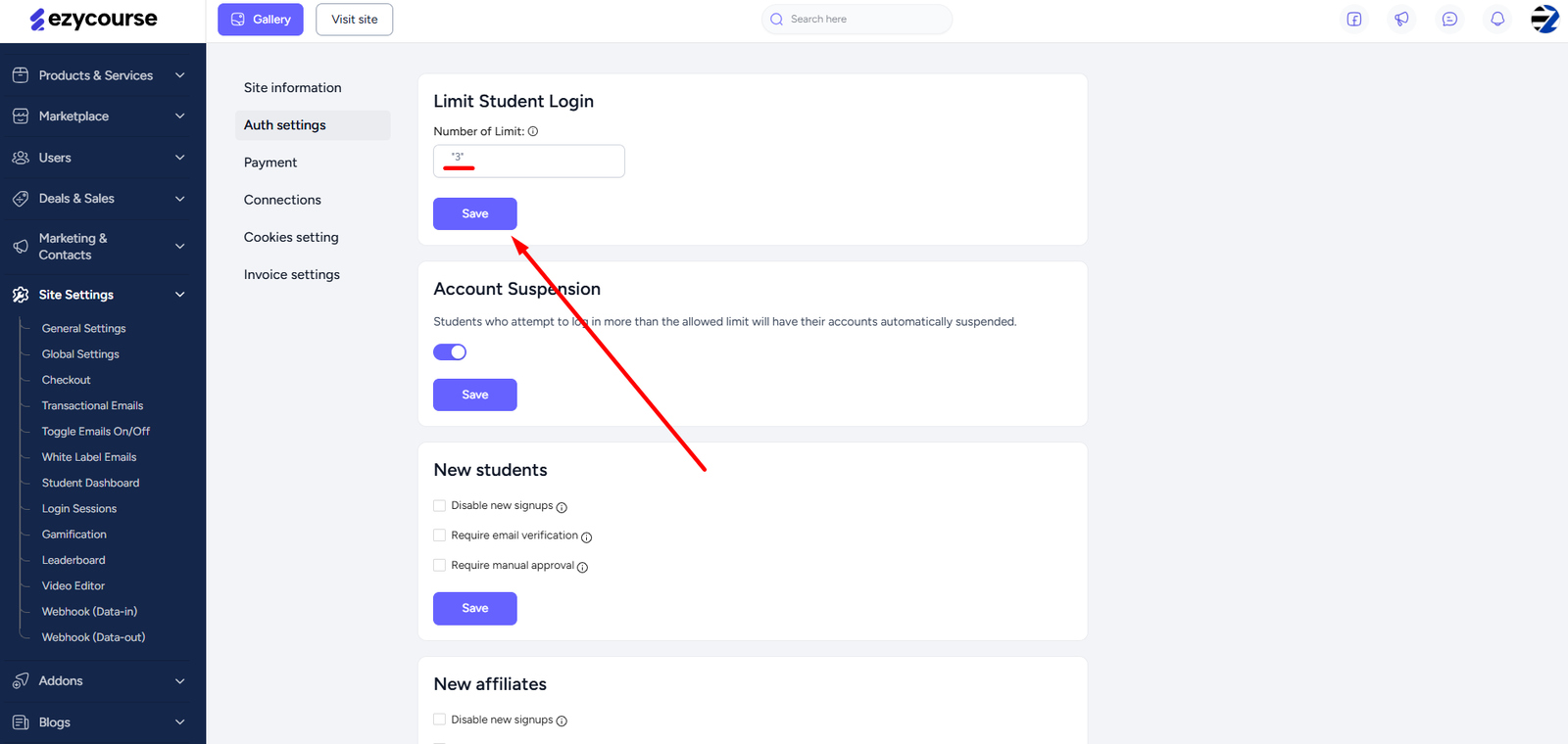 Simply set a number in the “Number of Limit” field and this will apply to all the students on your platform. Don’t forget to click the Save button.